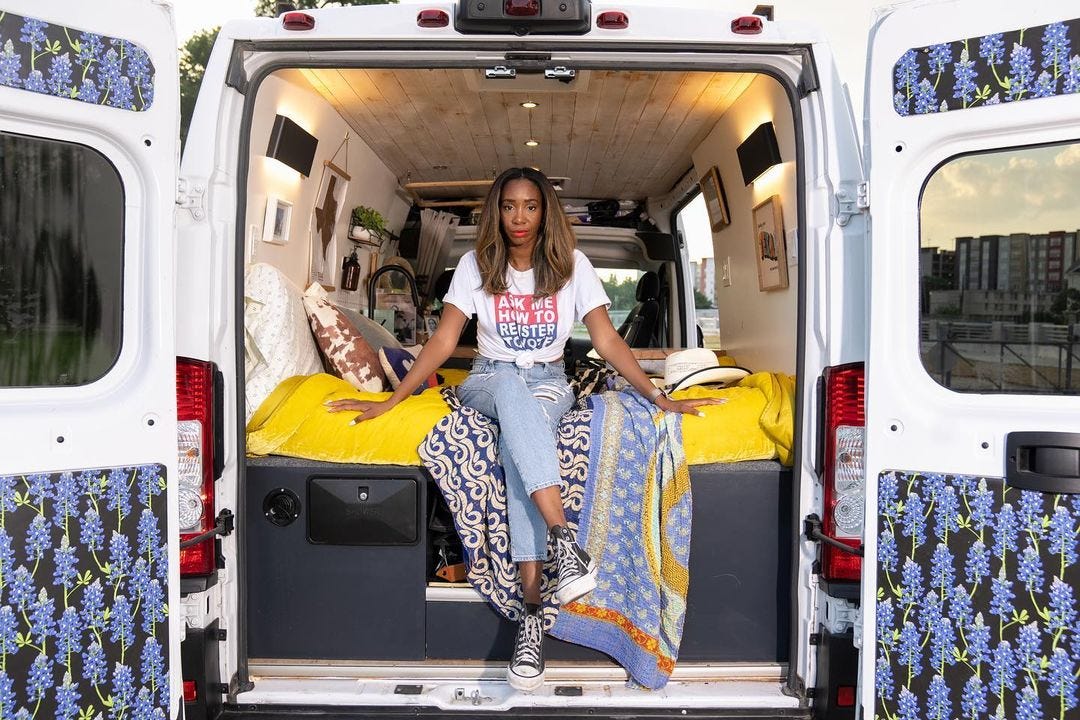 This week we chatted with Tayhlor Coleman, a seventh-generation Texan, vanlifer, and voting rights advocate. After working for dozens of campaigns and causes across the country, she moved back to her home state of Texas with the goal to get certified to register voters in each of the state's 254 counties. She fully converted her van ‘Barb’ (named for Barbara Jordan) into a tiny home and voter registration mobile on wheels.